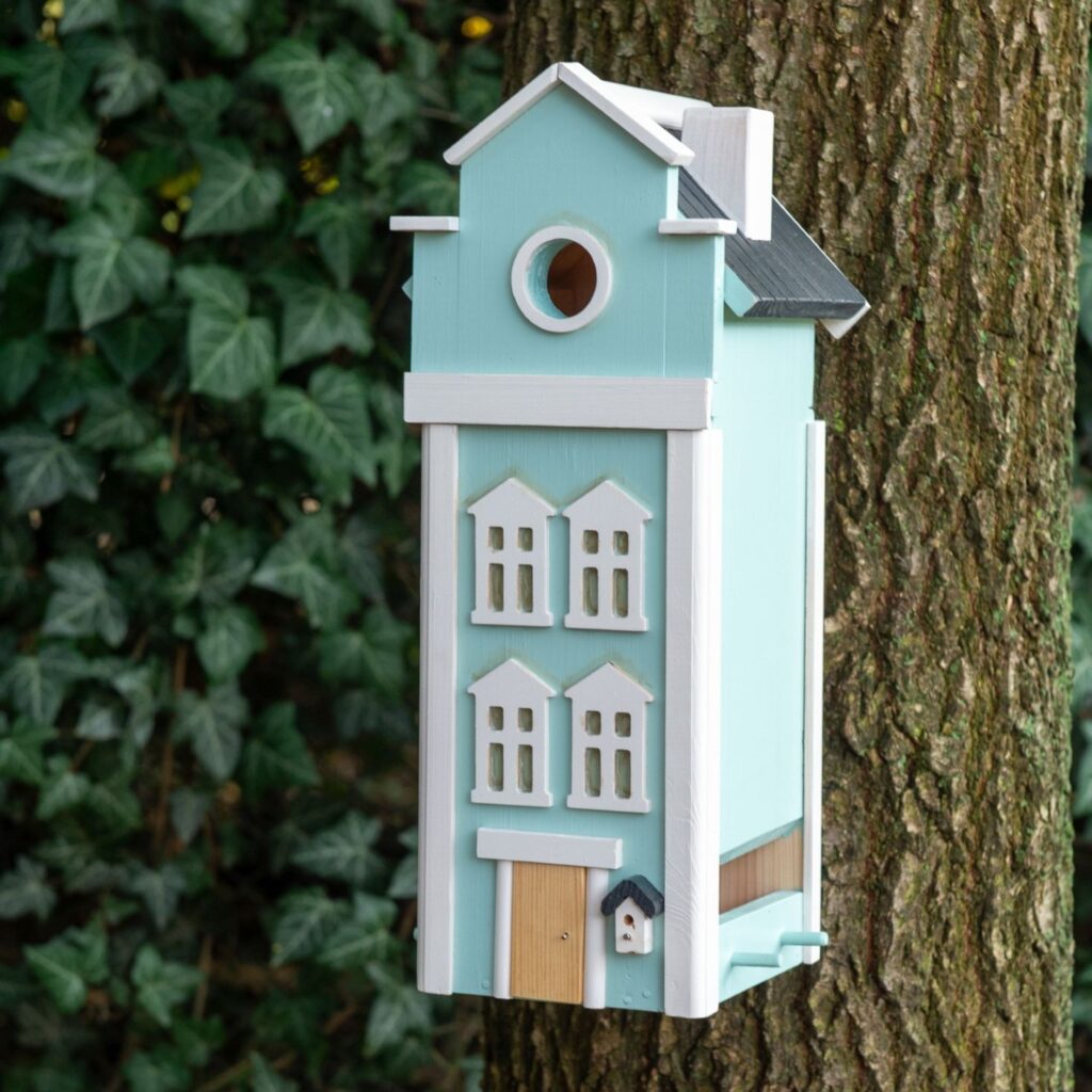 Ptasie kamieniczki to jednocześnie budka lęgowa dla małych ptaków oraz karmnik, dwa zastosowania w jednym produkcie.
